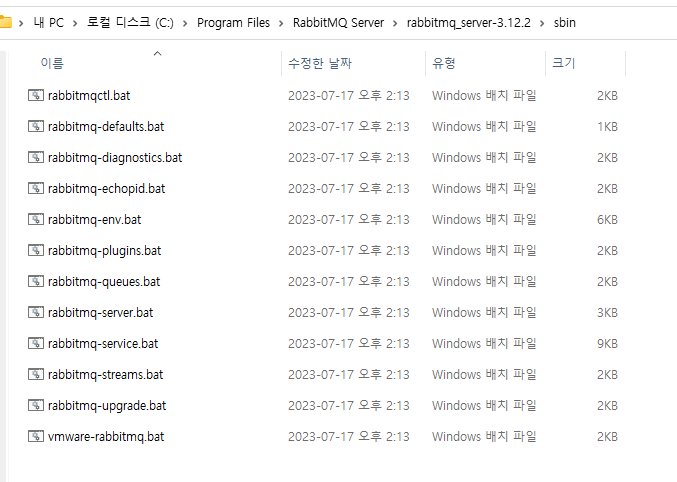 sbin 폴더에서 cmd 접속후 rabbitmq-plugins enable rabbitmq_management 해당 명령어를 통해 RabbitMQ management를 활성화 시킨다. 15672 포트가 이미 사용시 해당 15672를 사용하는 프로세스를 죽이고 재실행하거나 RabbitMQ management 포트를 변경시키는 방법을 적용해야 한다.